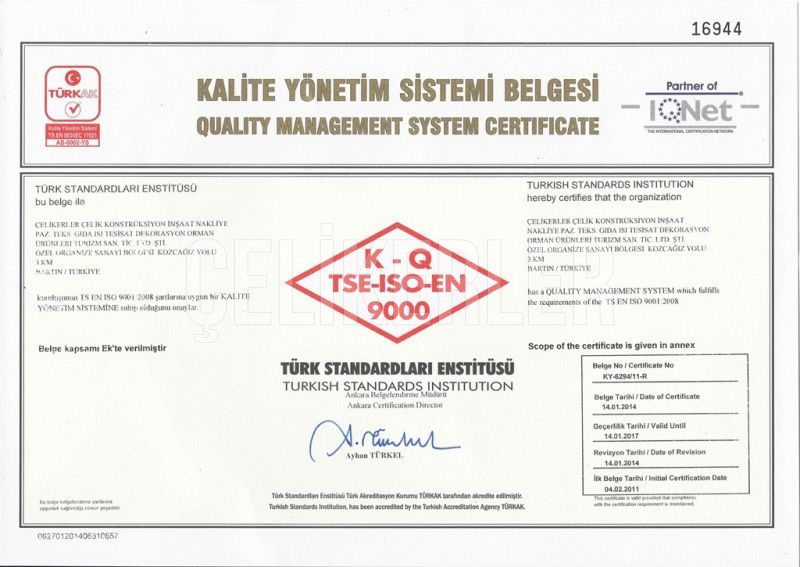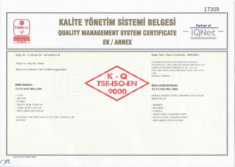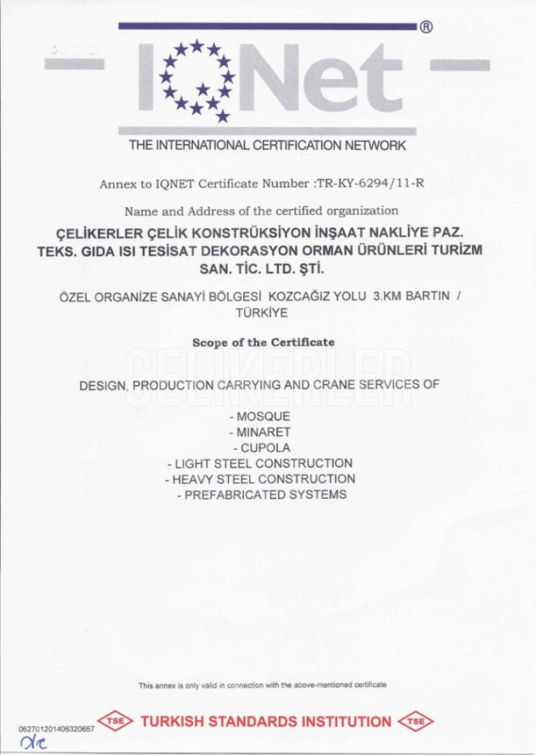 ÇELİKERLER life started in 1844 working with iron on Bartın ÇELİKERLER LTD. ŞTİ. was established in 2003. It combines its previous experience in the private sector with today's technology and closely follows local and international developments in its sector. The work is carried out in 25,000 m² of steel manufacturing It relies on providing services based on international quality in the field and aims to be a leading company in the field. Çelikerler provides services in a number of fields Steel Structure (Prefabricated House - Steel Construction House - Heavy Industry Buildings -Container - Construction Site Structures), Steel Mosque Dome MinaretIt has expanded the boundaries of quality and service in the field and signed many Successful projects in the country and abroad. Customer satisfaction is the primary principle at Çelikerler Çelikerler is expanding in its sector without any sacrificing its quality.Çelikerler company will continue values people first in each of its projects, implementing its projects according to safety rules